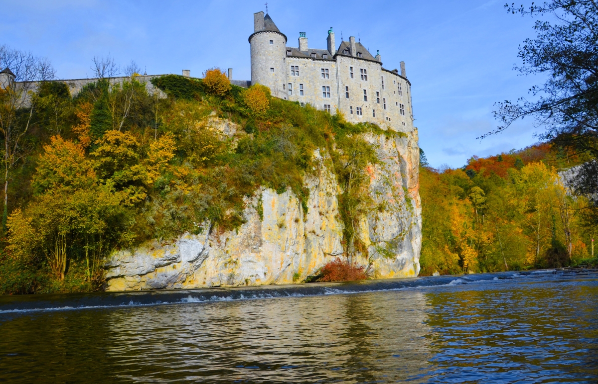 Tại vùng quê của chị Vân có rất nhiều tòa lâu đài đẹp như Spontin, Freyr, Veves, Walzin... Trong hình là lâu đài Walzin bên sông Lesse gần Dinant, tỉnh Namur. Lâu đài được xây dựng vào thế kỷ 13, hiện thuộc sở hữu tư nhân nên khách chỉ có thể quan sát từ xa.