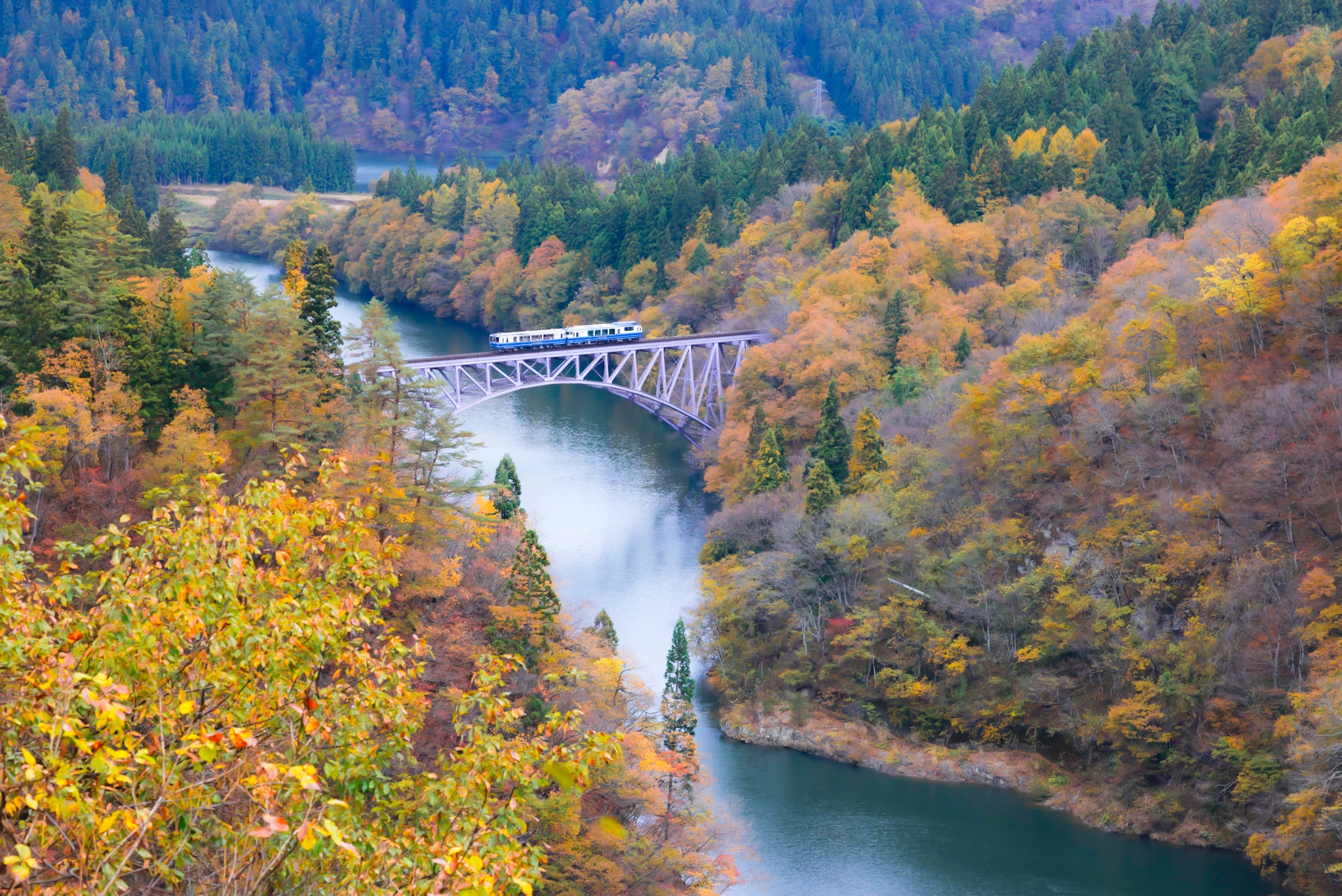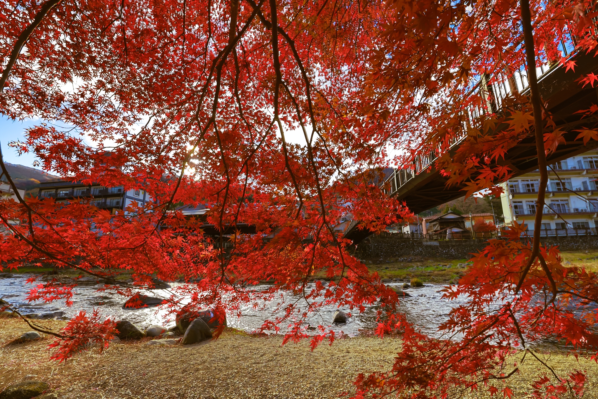 Hải An cho rằng bất kỳ góc nào ở Nhật Bản nói chung và Fukushima nói riêng, chỉ cần giơ máy lên là có thể chụp được những bức ảnh đẹp. Hình ảnh trên được An chụp ở một trạm dừng chân trên đường đi, nơi có cây cầu treo, một dòng suối nhỏ và những cây lá phong đang đỏ rực rỡ.