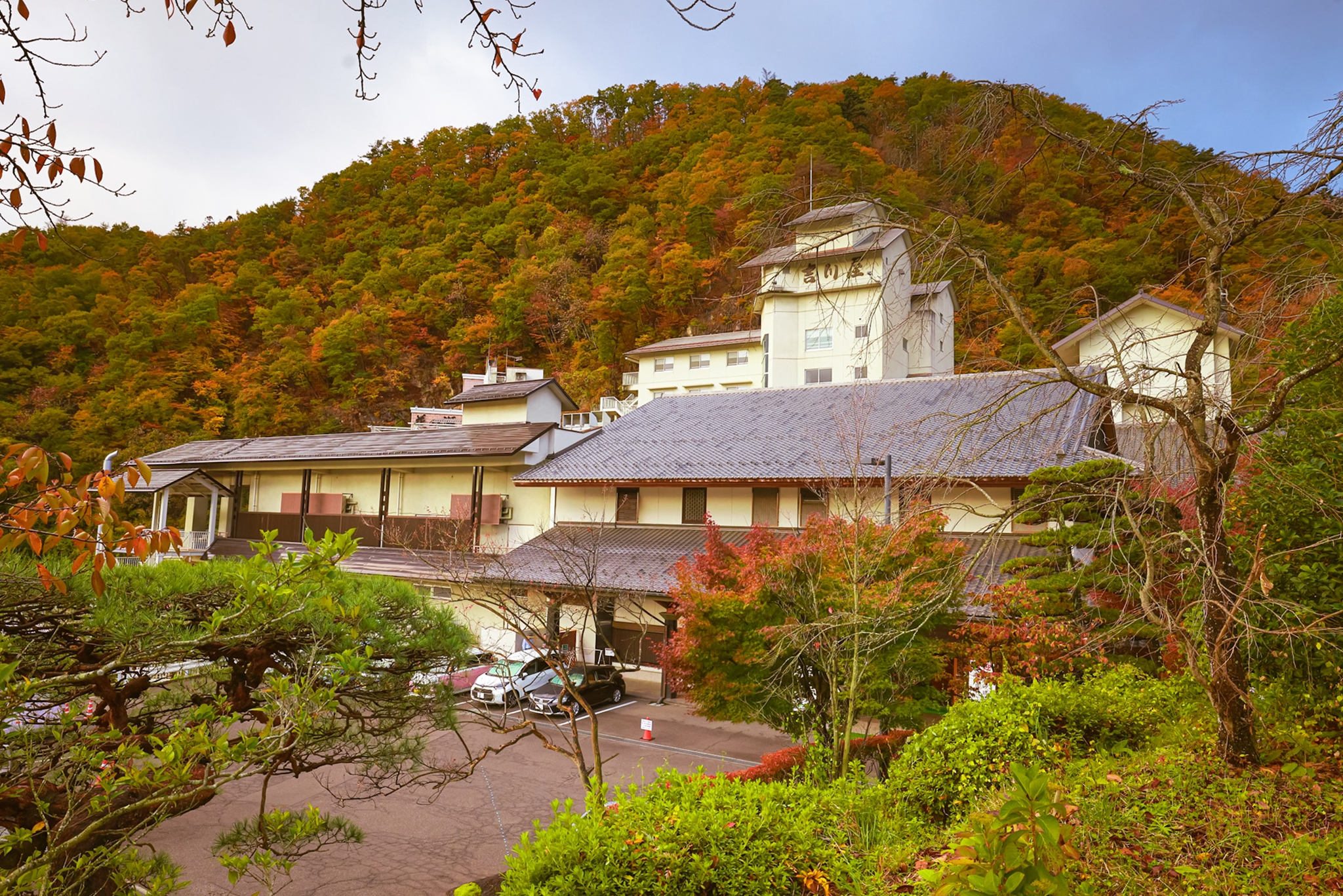 Không gian bên ngoài khu onsen nổi tiếng tại Fukushima, Aanabara Onsen Yoshikawaya. Ở đây có nhiều phòng nghỉ truyền thống Nhật Bản (ryokan). Tắm onsen ở Fukushima là một trong những trải nghiệm không thể bỏ qua. Các khu suối khoáng nóng ở Fukushima có chất lượng cao hàng đầu Nhật Bản, tốt cho sức khỏe.